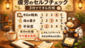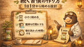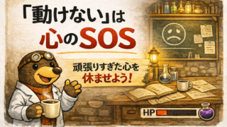 モグラ博士の地下ラボ 2026.02.222026.03.22 新着記事 状態を知るための小さなチェック 2026.04.04 自己理解室③ 2026.03.21 自己理解室② 2026.03.21 習慣化設計室③ 2026.03.21 習慣化設計室② 2026.03.21 人気記事 続く習慣の作り方:1日1分から始める設計 2026.02.212026.02.22 自分の取扱説明書を作る:最初の3つの質問 2026.02.212026.02.22 疲労のセルフチェック:3分でできる点検 2026.02.212026.02.22 リカバリー設計室② 2026.03.21 動けない人に出やすいサイン7つ。やる気の問題ではないかもしれない 2026.03.212026.04.05 コンディションチェック室 〜今の自分の状態を知る〜 動けない人に出やすいサイン7つ。やる気の問題ではないかもしれない 2026.03.212026.04.05 「動けない」のは、あなたのせいじゃない。頑張りすぎた心が教えてくれるサイン 2026.03.212026.04.05 疲労のセルフチェック:3分でできる点検 2026.02.212026.02.22 「コンディションチェック室」の記事をもっと見る 自己理解室 〜自分のことを知る〜 自己理解室③ 2026.03.21 自己理解室② 2026.03.21 自分の取扱説明書を作る:最初の3つの質問 2026.02.212026.02.22 「自己理解室」の記事をもっと見る リカバリー設計室 〜崩れても戻れる土台を作る〜 リカバリー設計室③ 2026.03.21 リカバリー設計室② 2026.03.21 「リカバリー設計室」の記事をもっと見る 目的設計室 〜動きたい方向を決める場所〜 記事は見つかりませんでした。 目的設計室 習慣化設計室 〜続けやすい仕組みを作る〜 習慣化設計室③ 2026.03.21 習慣化設計室② 2026.03.21 続く習慣の作り方:1日1分から始める設計 2026.02.212026.02.22 「習慣化設計室」の記事をもっと見る 休息室 〜休む為の部屋〜 記事は見つかりませんでした。 休息室